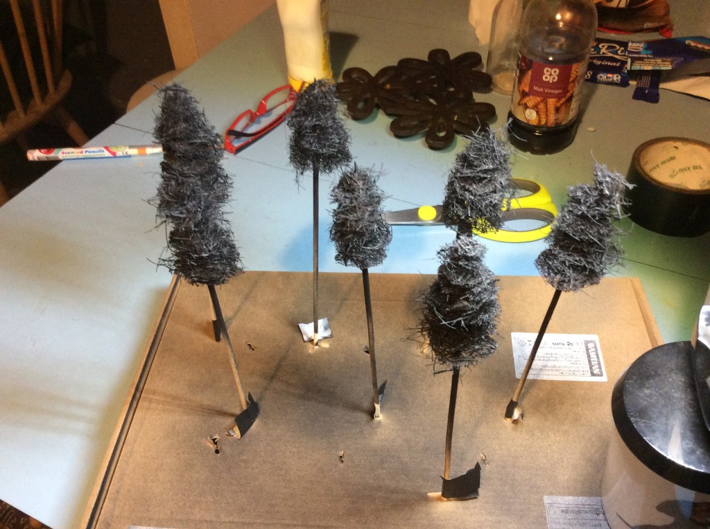 So here we have three ‘trees’, it was definitely worth doing as it gave me a bit of a chance to be a bit artistic and also they will probably look better than the cake decorations. Now I do actually possess the Woodland Scenic conifer and deciduous tree armatures, but to be honest these were probably more fun to do…