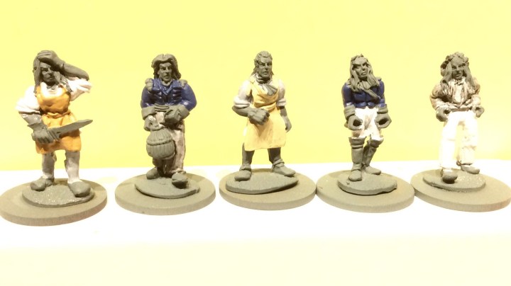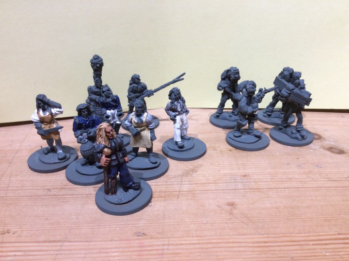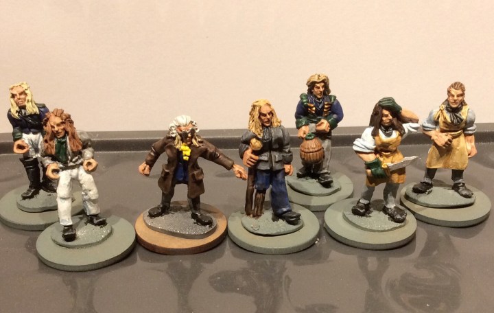 This is a base colour for the clothing and skin, onto washes and highlights later on when the paint dries. Although a rag tag bunch each has the blue and the green colour to help tie them in together.
