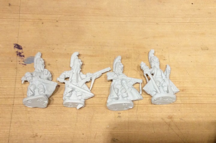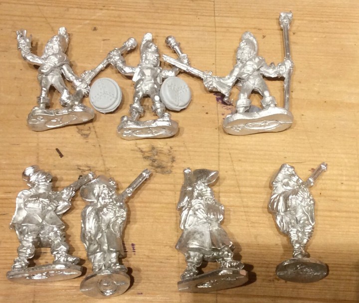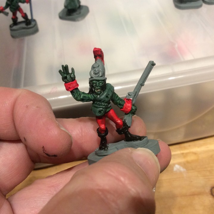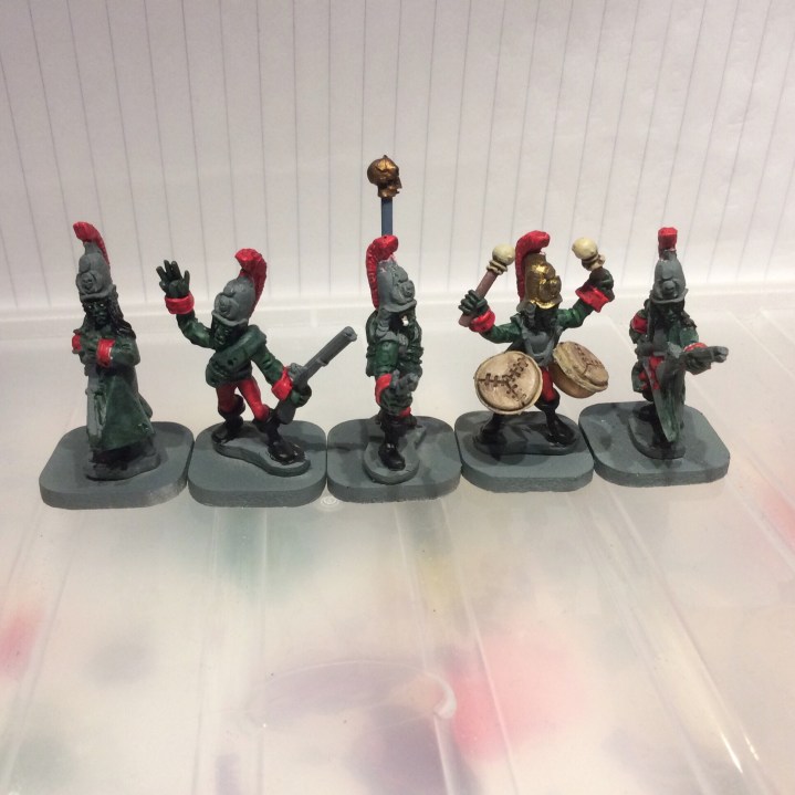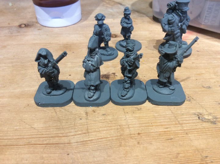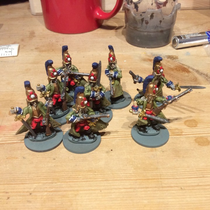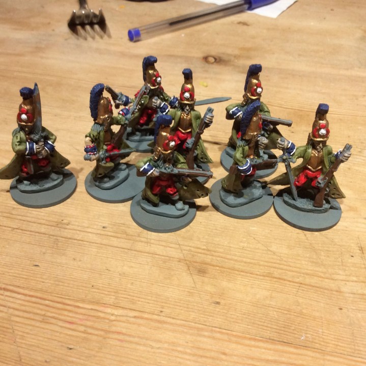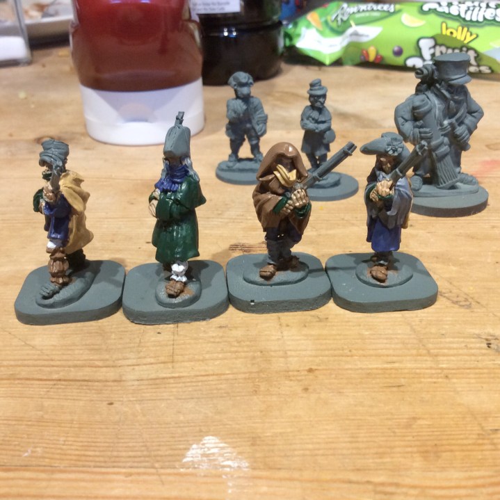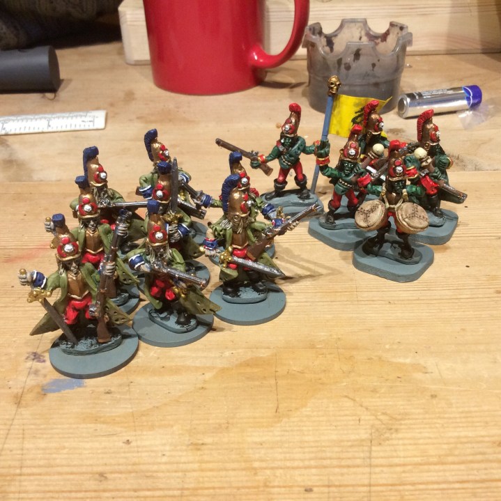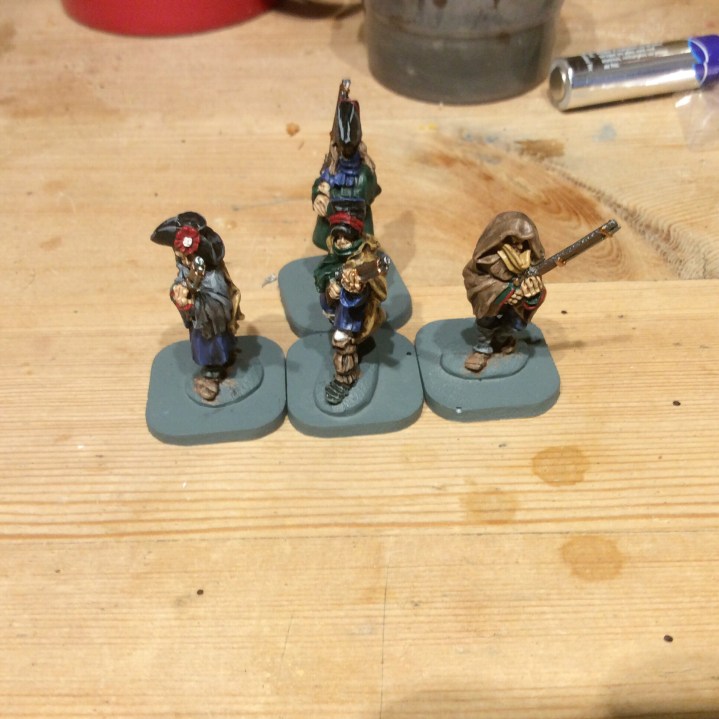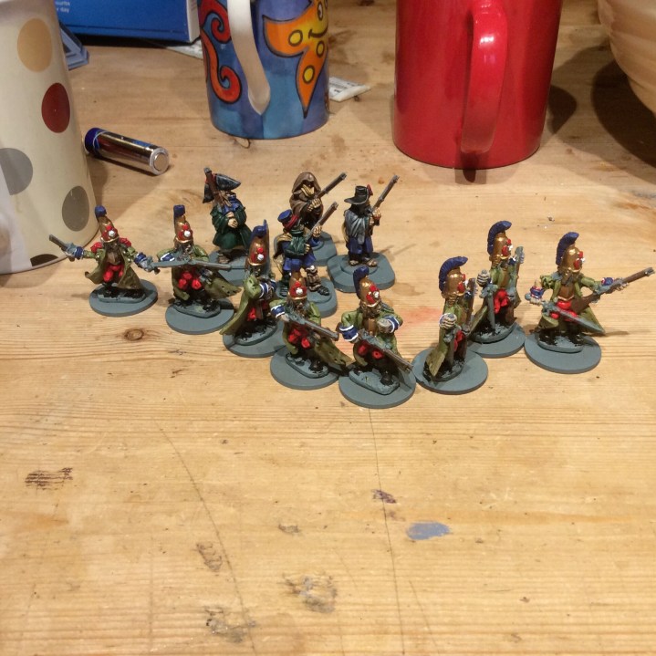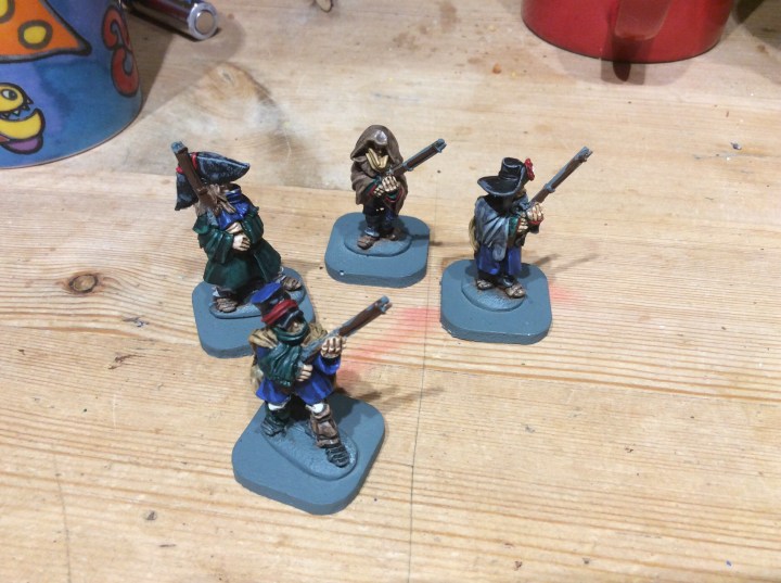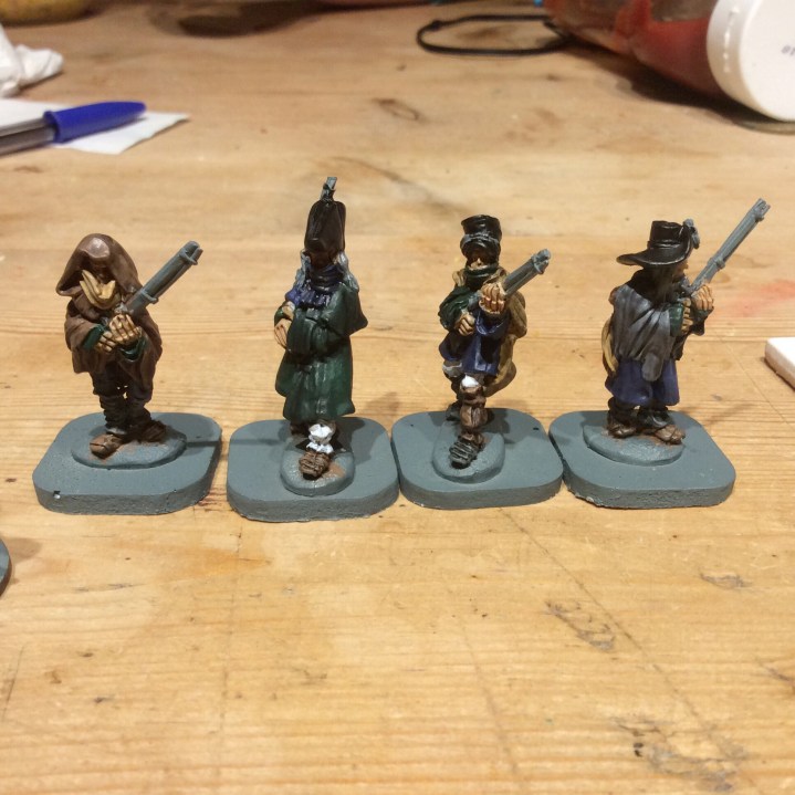 They are pretty much finished apart from the metalwork on the muskets and a bit of toning down on the grey highlights on the black hats. It didn’t darken down a# much as I expected when it dried.