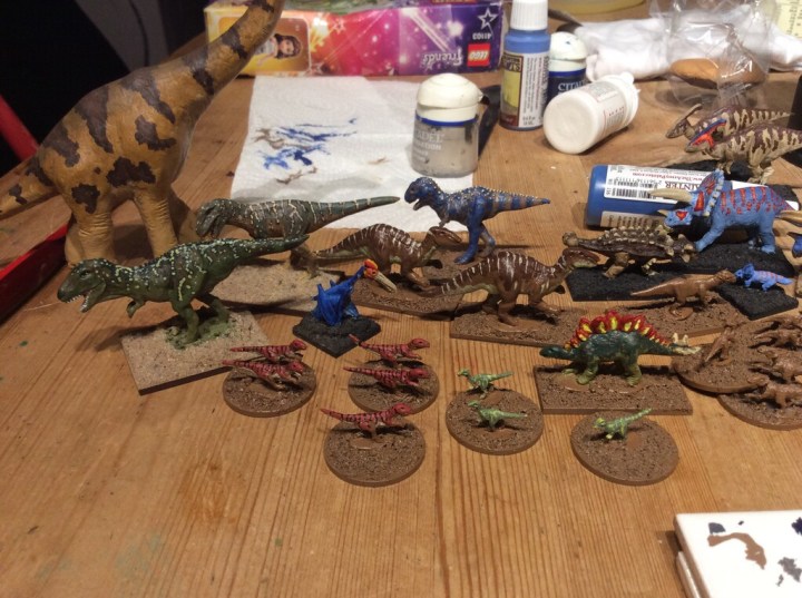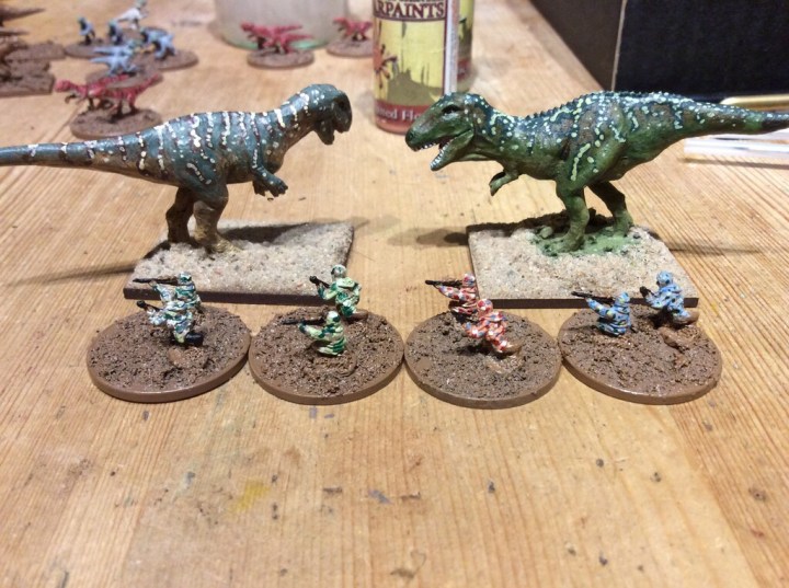 The human hunters are Pendraken (WW2 Russian Snipers) the dinosaurs are Magister Millitum. Each person took a two man team and had to shoot the male triceratops to win. The other dinosaurs were there to either get in the way or to eat the players.
