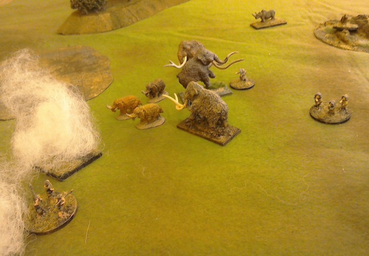 The humans are Magister Millitum Eskimo and cave men. The adult mammoth are Pendraken, babies are Irregular miniatures 6mm Tusk mammoth and the rest of the fauna are Magister.