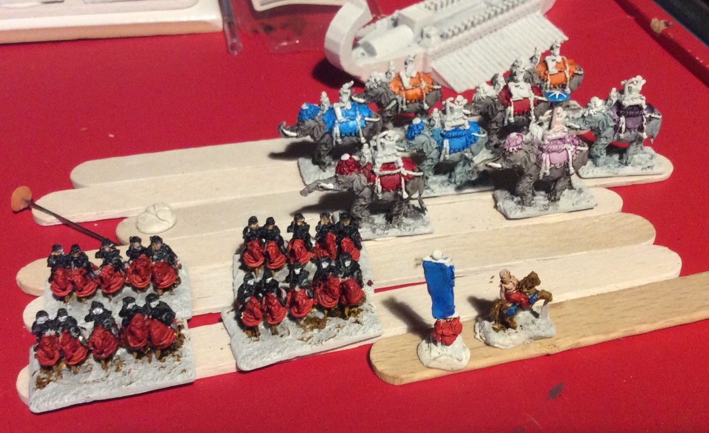 The parasol is attached to an howdah. I used a micro drill to get a hole in it then cut off the pin to the right height. Typically I put it on the wrong ‘purple’ elephant! The hero and standard are in the foreground. One will go with the general and the other with a second elephant to act as a sub general, well that is the plan. As it isn’t exactly the world’s largest army then this may change. What may happen is the rider and standard will go onto their own base to act as the hero, that in the long run might be a better idea.