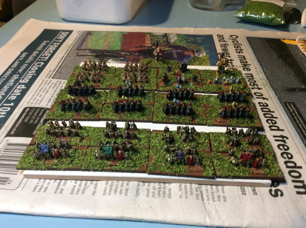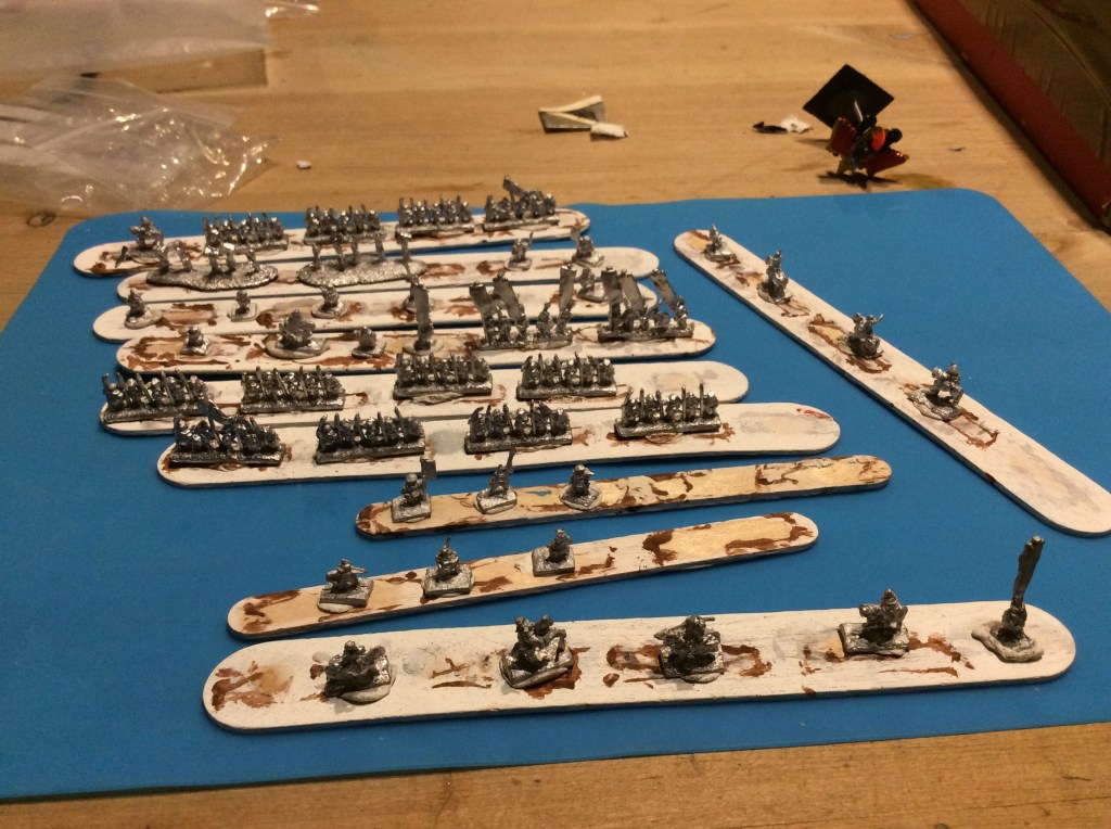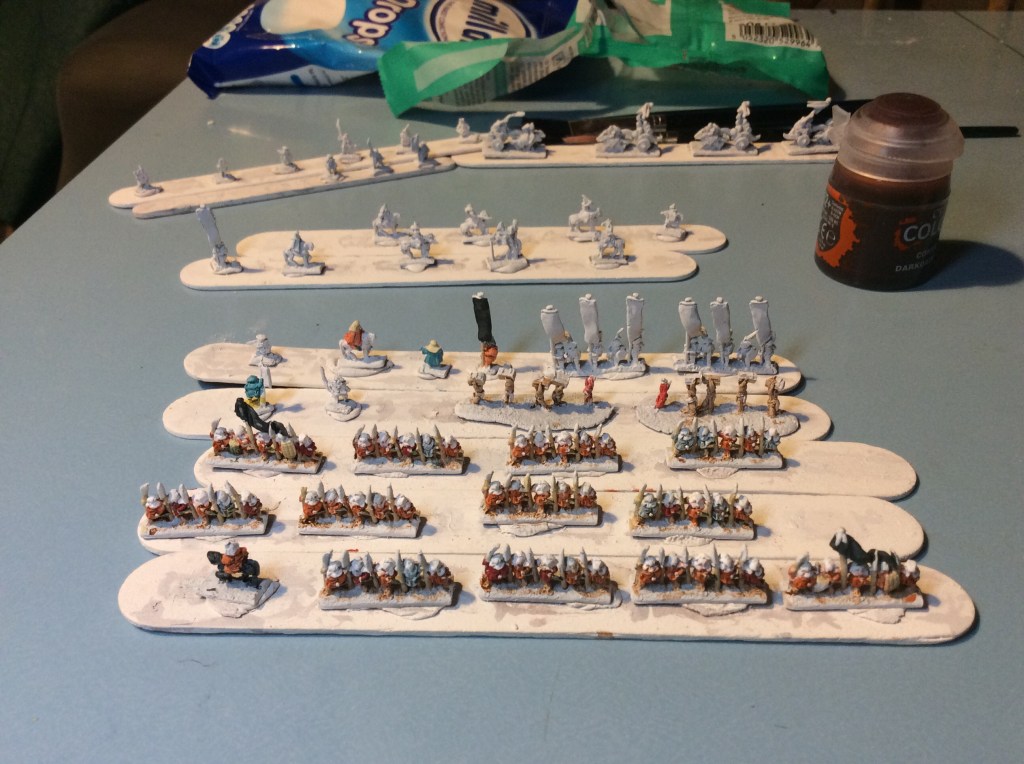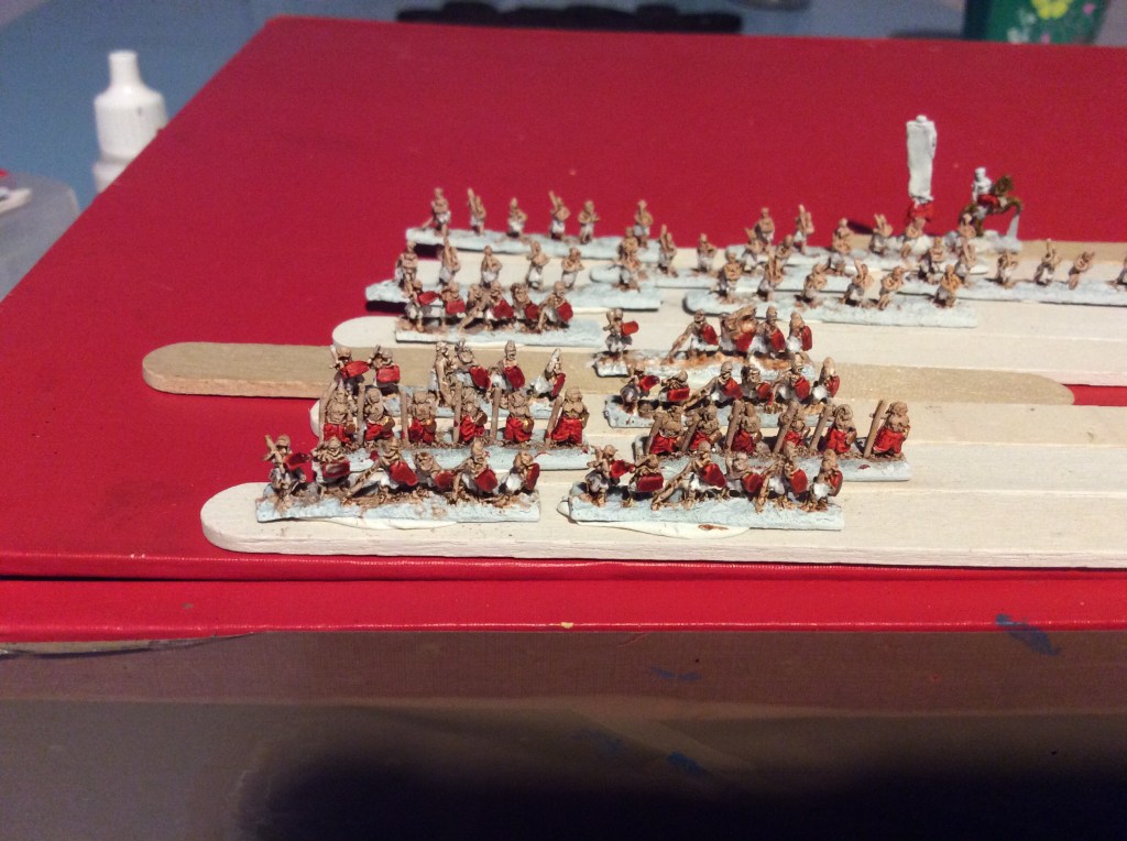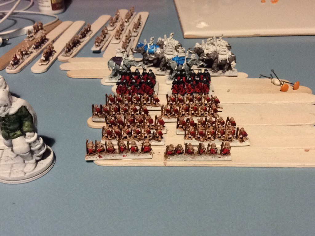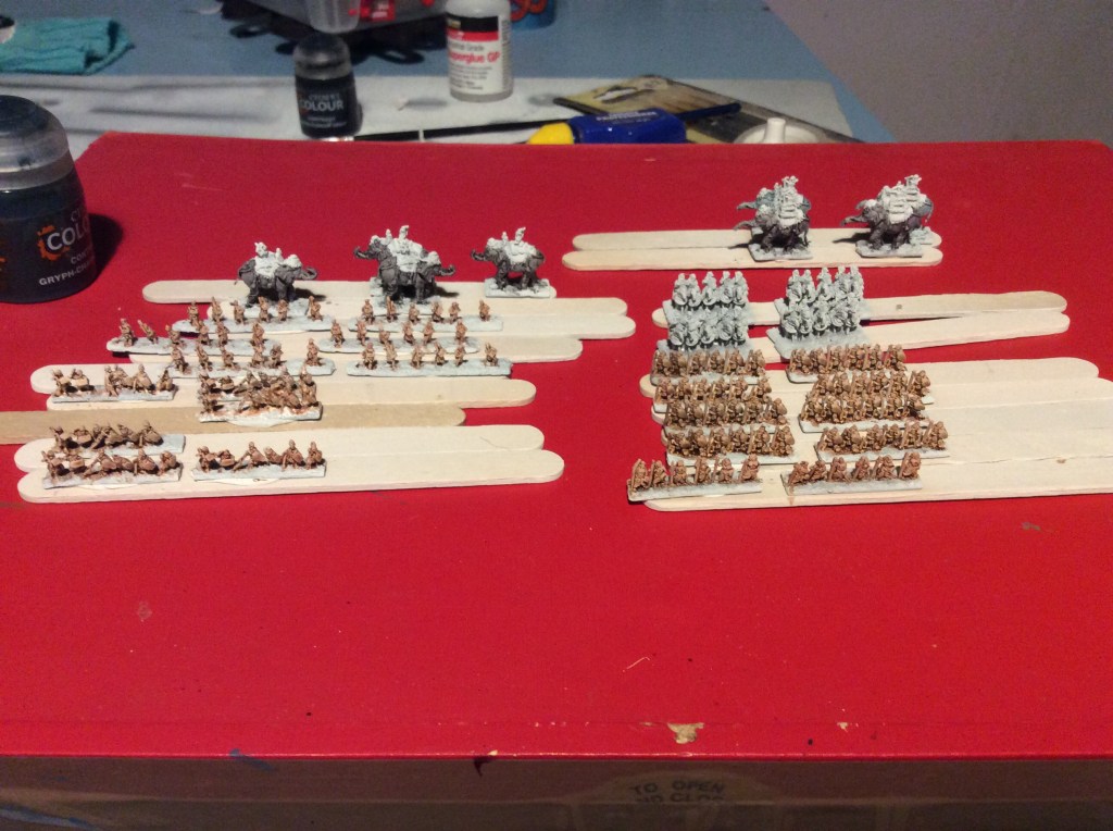 The 6mm Khmer have had a bit more paint added this evening. I decided to push on a bit more and got most of the spear shafts done. I also went over the armour on the cavalry and sorted out the elephants to get some white undercoat back on.