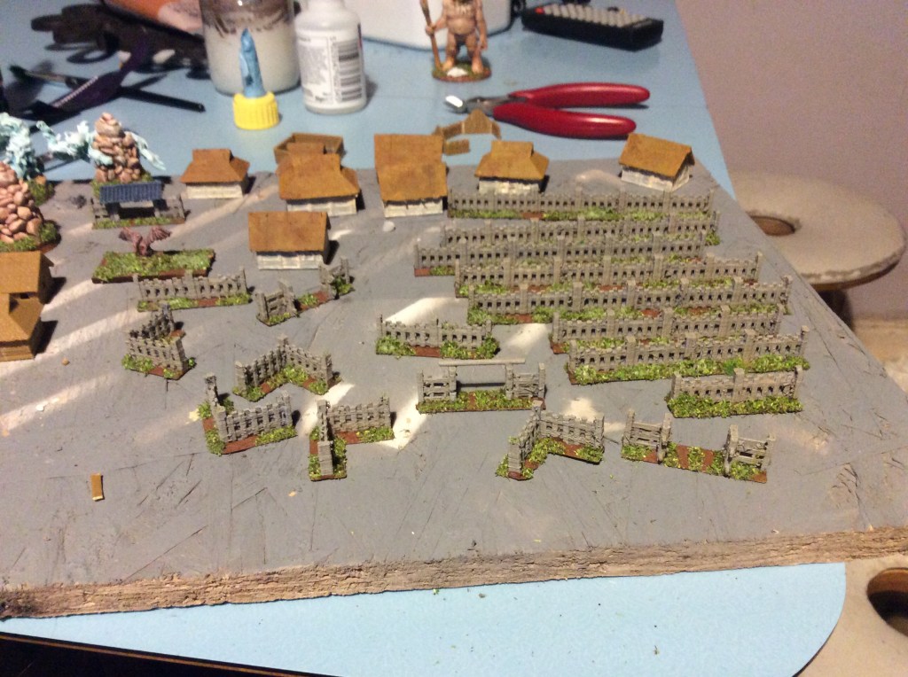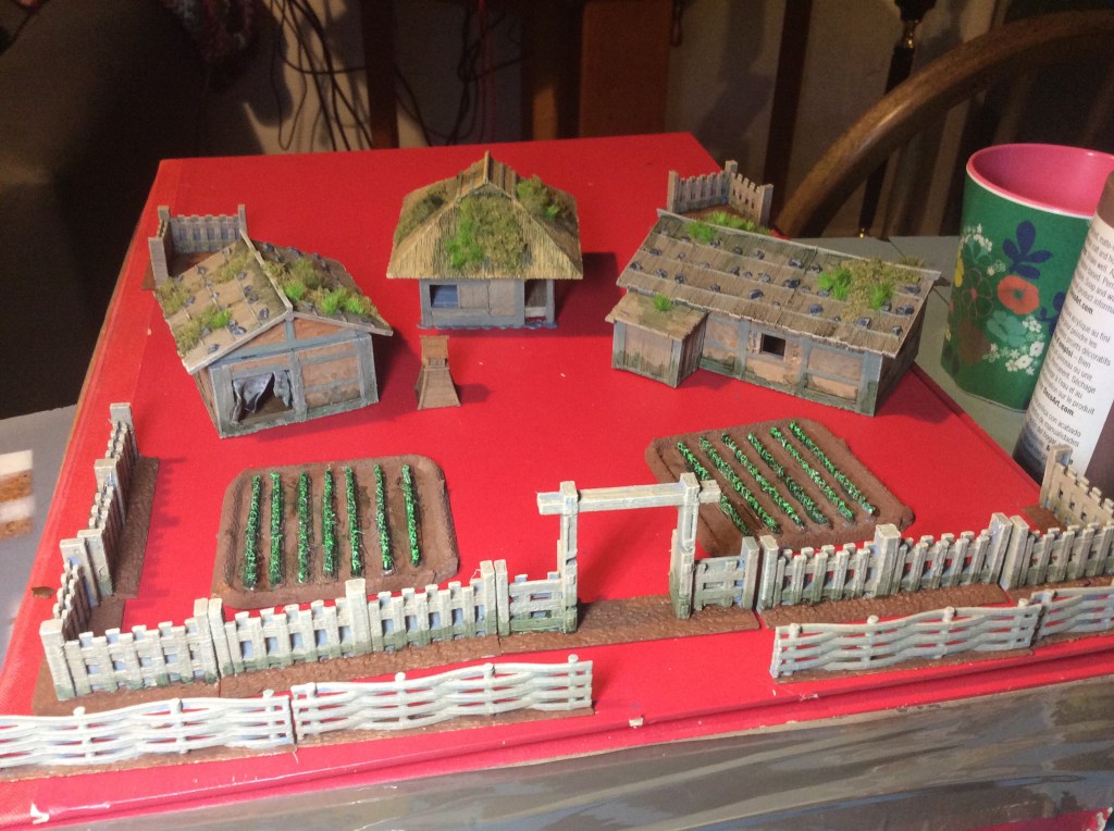 While I was messing about putting the buildings on, I noticed my neglected 15mm Samurai on the shelf. I stuck a Couple of peasants and water buffalo in and voila a pen for 15mm farmers to keep their animals in. Yeah I know they wouldn’t be of that construction , but pretty multi purpose nonetheless.