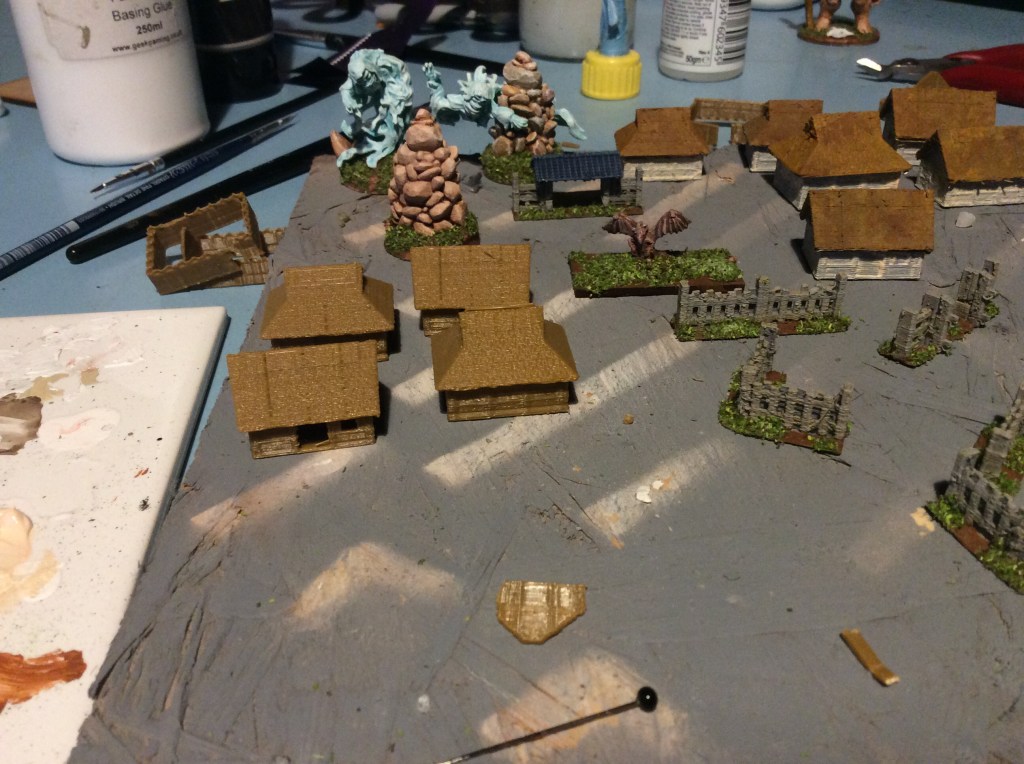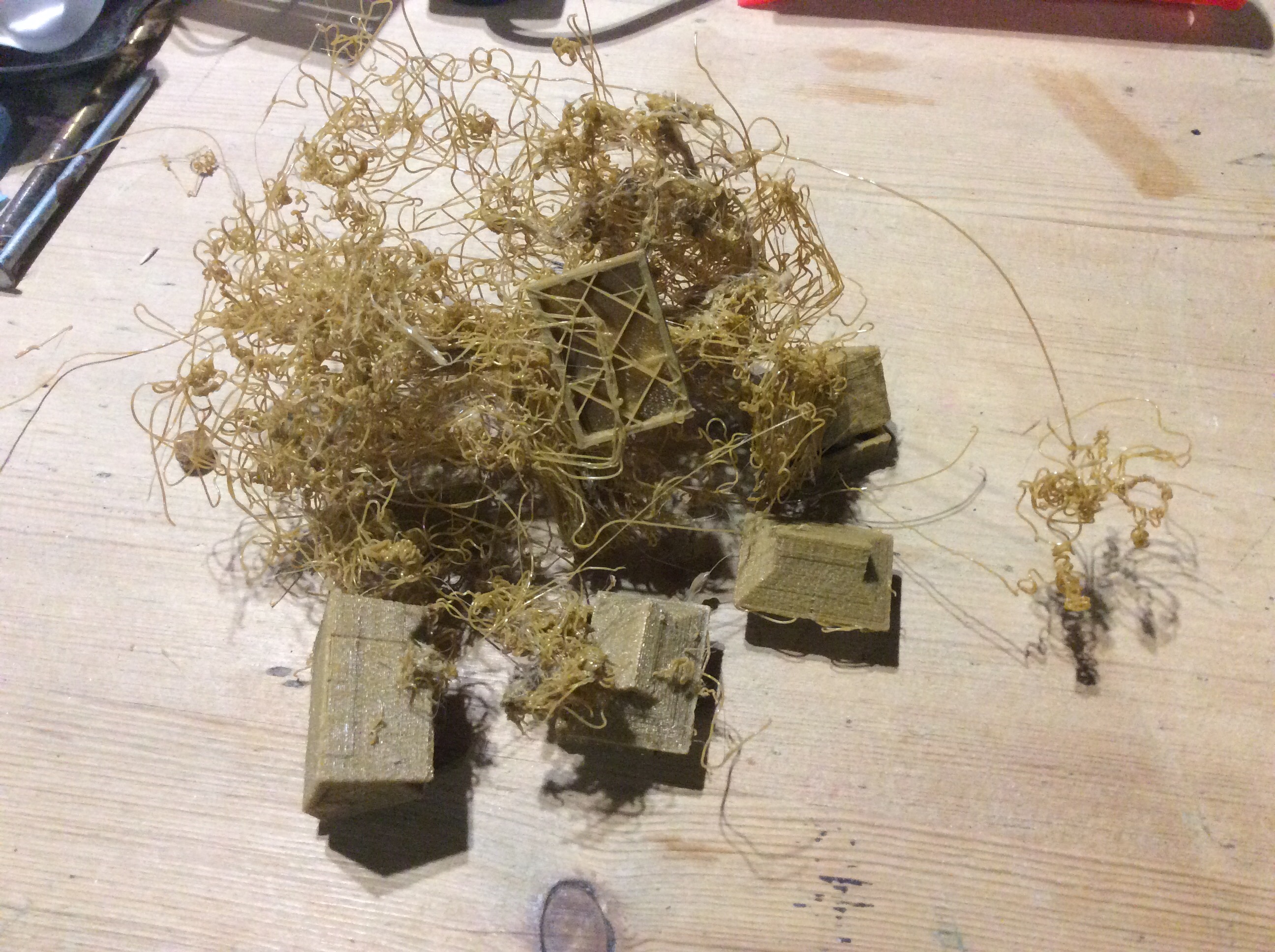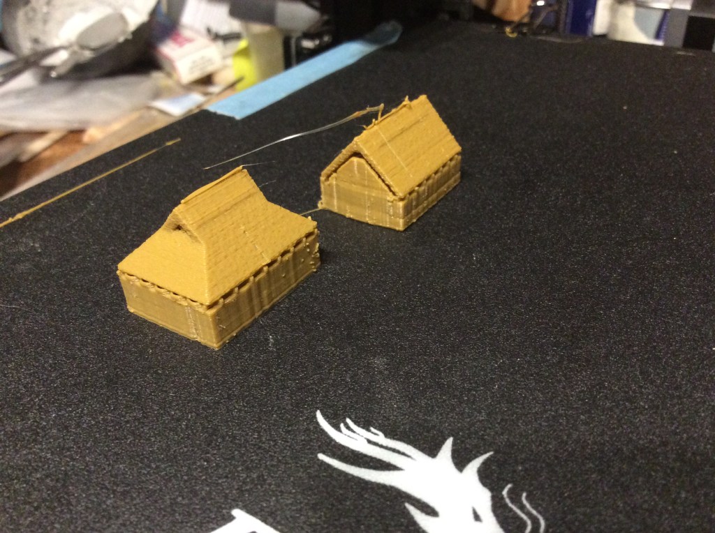 I started off printing them again and noticed a problem coming up so I stopped the print. Tonight I managed to rescue some of the roofs from the mess above and match them up with the building walls. I reckon that I can rebuild four of them. A bit of sanding and some superglue and voila, a set of useful buildings.