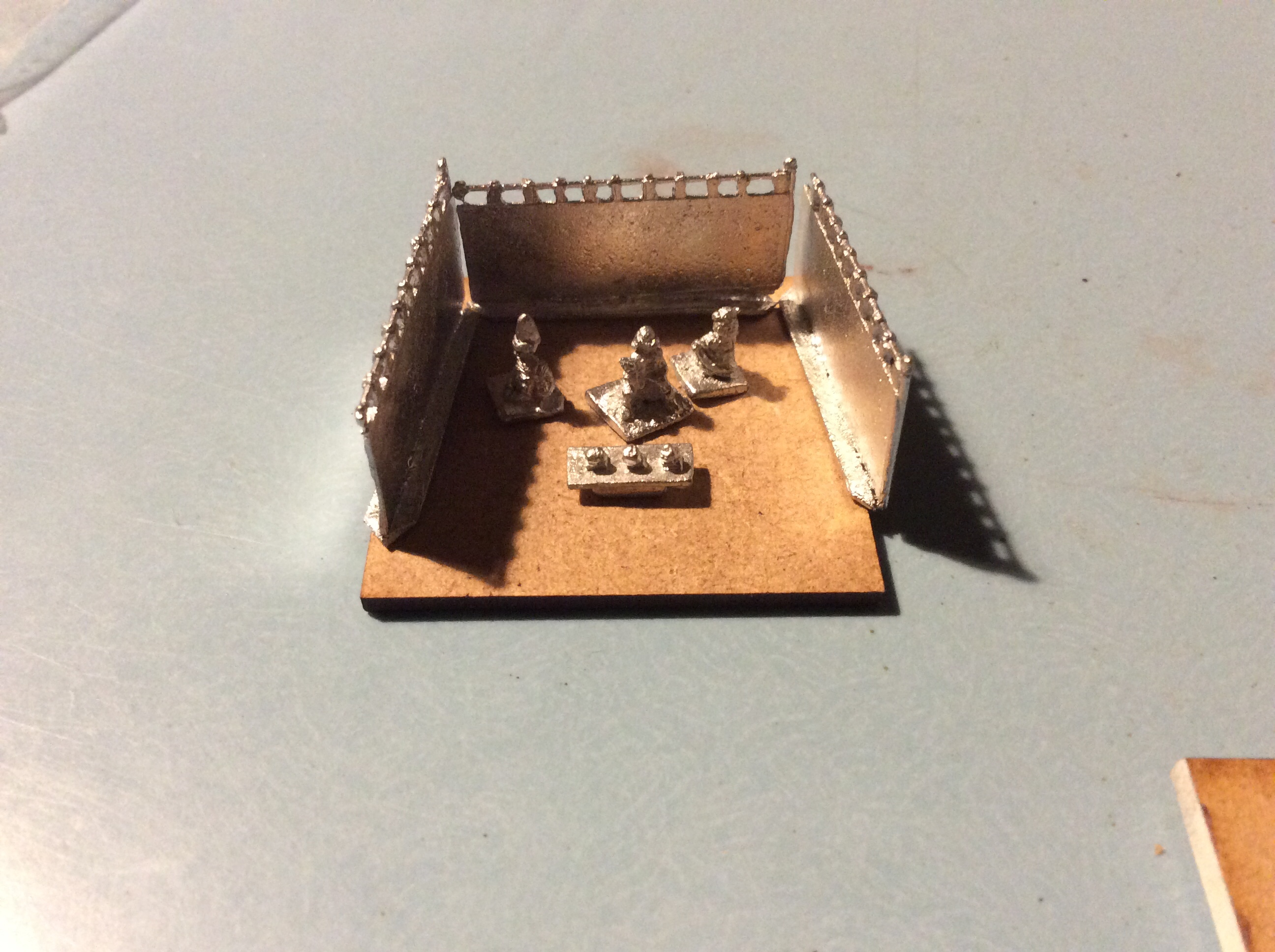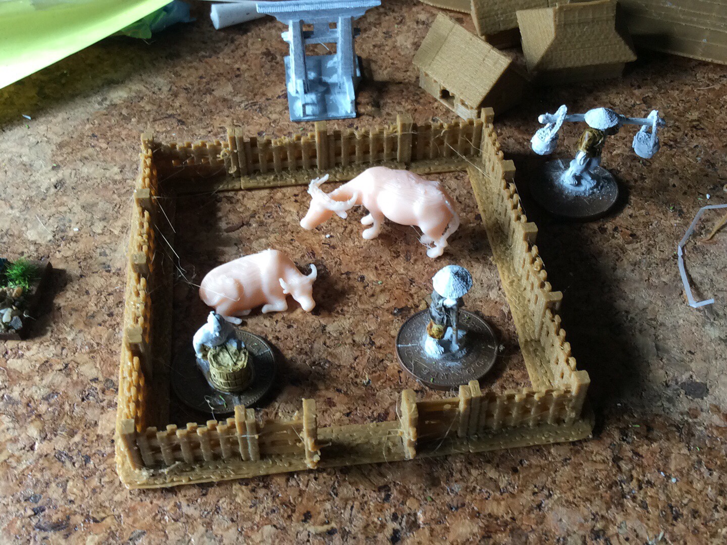 Now it isn’t perfect by any means and the top of gate posts failed both times, but I am really happy at how well the printer coped with it, as can be seen it will hold up to four of the printed buildings nicely. It could also make a useful compound for a shrine or small fortification.