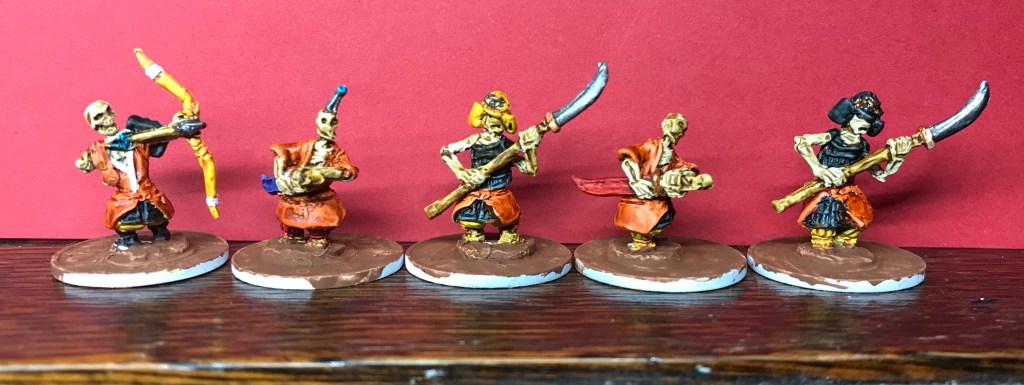I managed another five skeleton Samurai this evening. I went for an orange colour for the robes this time. Tomorrow I will go for a green colour. These are nice and quick to paint…okay I could spend longer and do a lot more work on them.. but hey I want them finished.