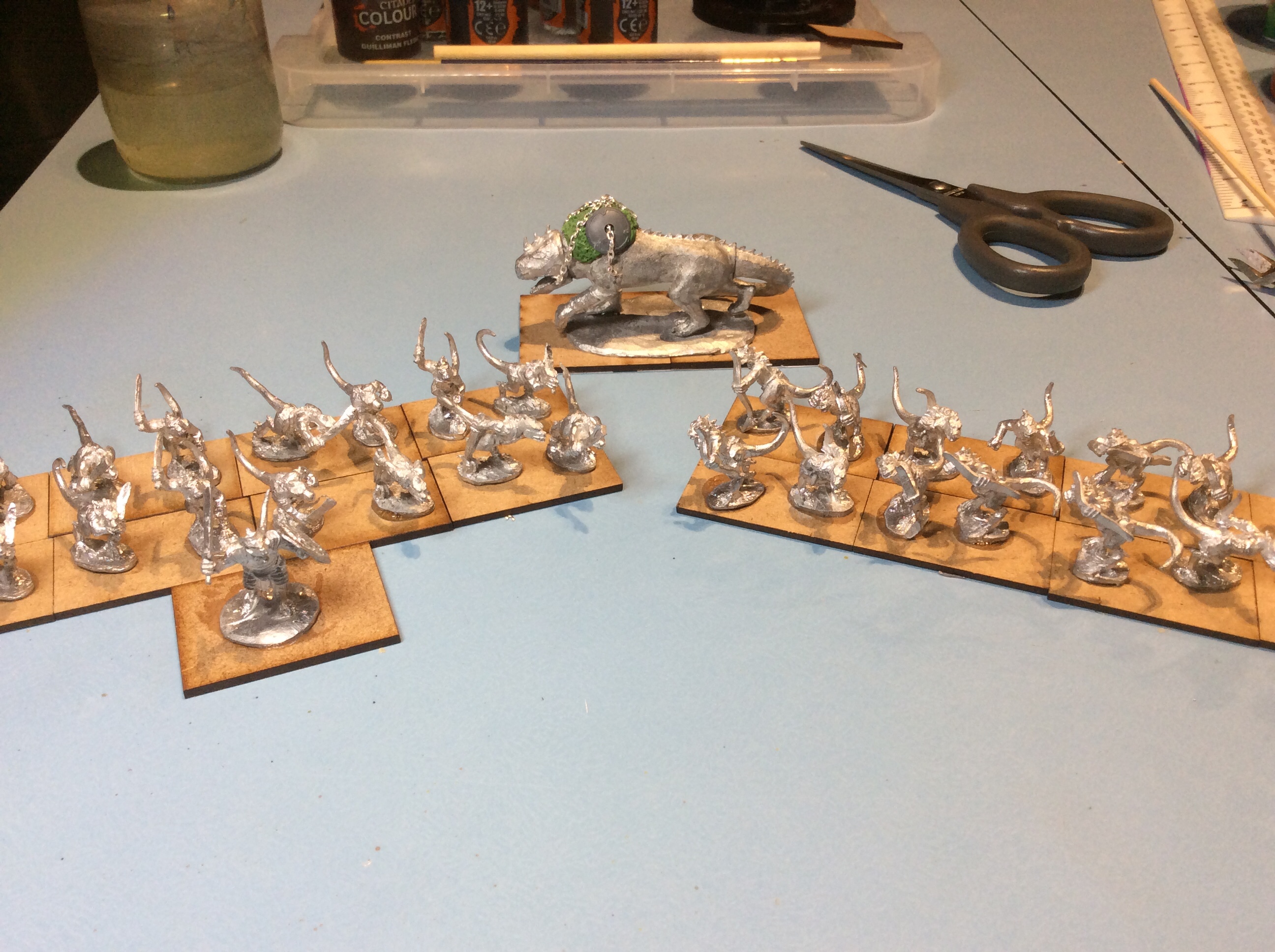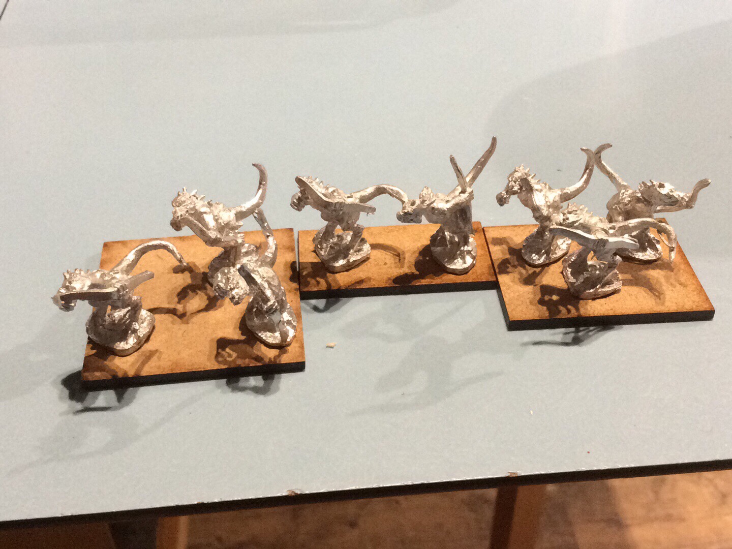 Here they are so far. They still have weapons and shields to do and then sort out any missed bits. These were really nice to paint so thumbs up to the sculptor as they were pretty speedy to do. Yeah I could have spent more time sorting out stripes and things but decided against it. I decided to make a leader by adding a back banner as befits an Aztecesque Beasty. Once the Greenstuff has cured I will cut it down and make it colourful. The leader is the only one that is a different colour. My original idea was to go black, then purple, but instead I went for grey, trying to make an albino type that would mark him out as special. His mount is the only one with s coloured crown too (well yes grey is a colour, but I meant bright colour).