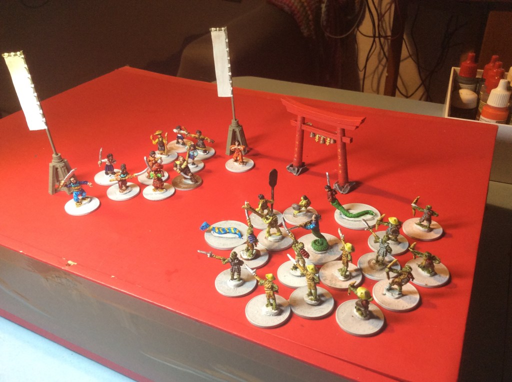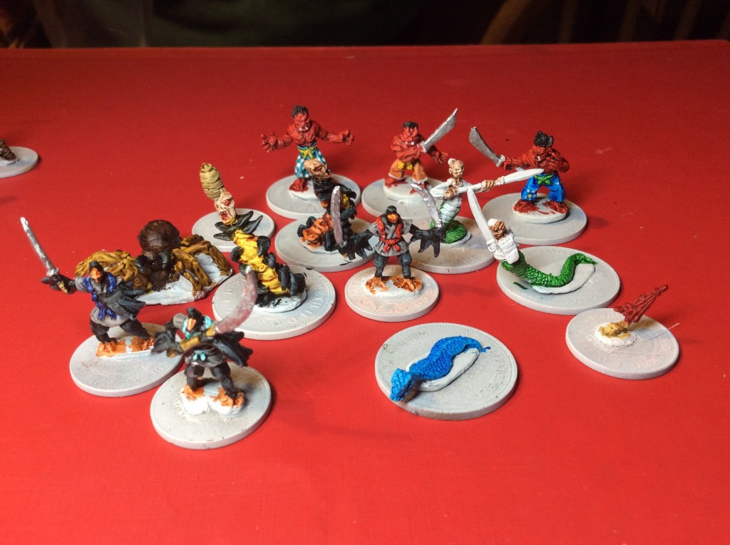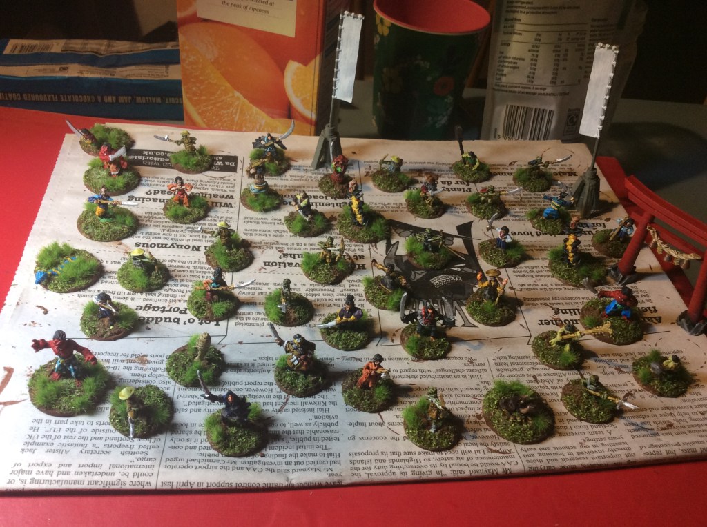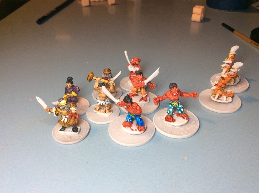 The rest of the ones I started yesterday are just about done apart from the blades weapons. The armoured samurai is going to have different coloured armour. The two orange things to the right are centipede demons…