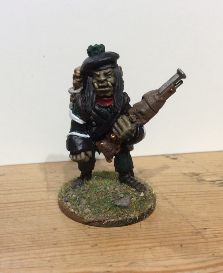 He is an elderly Orc from the hills of Albion. There is probably no better shot in the whole army. He has been known to drop enemy troops at miraculous ranges or through the tiniest gaps. He knows how to get the best out of his Bakur rifle. Keeping everything covered in best brown paper when not in use.