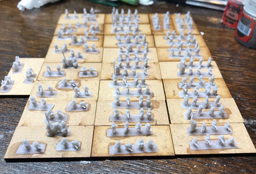 The eight bases on the right need hats and flags doing. Then this lot and will need sand adding to the bases before joining eighteen more stands that need paint adding.