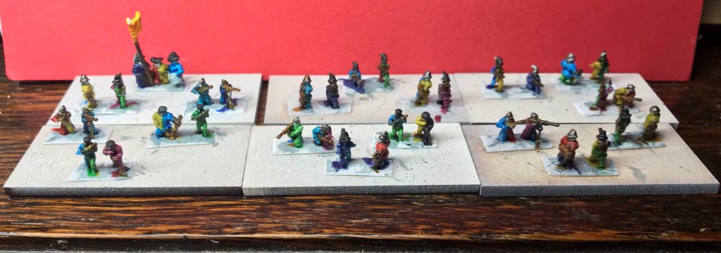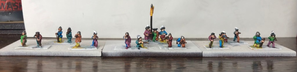 Yes, I got my flexible arqubusiers sorted today, only to find that I am short. It didn’t help that I got carried away doing ranked ones. The rules state 8 Pike and 8 guns. I reduced the size of the Pike to half size, but forgot with the arqubusiers…