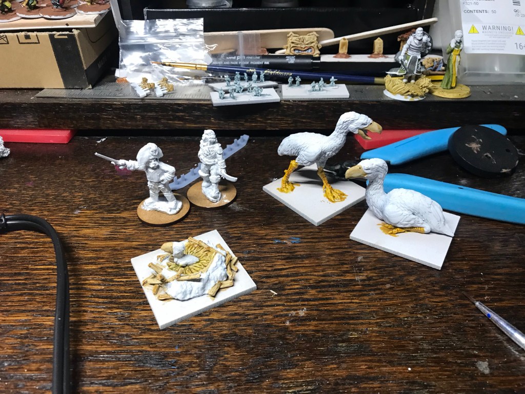 I did another skirmish unit for the Italian wars… it won’t win any prizes but it is done. Funnily enough these seemed a lot easier than the last set of three bases. I honestly think it was mental state rather than difficult miniatures. The 15mm monster hunter miniatures probably cleaned the palate for want of a better term. I want these finished and out of the way. I think the destruction of two Pike blocks put a downer on the whole project. I also brushed on an undercoat for my two ‘Spanish’ Officers as well making a start on the terror birds…