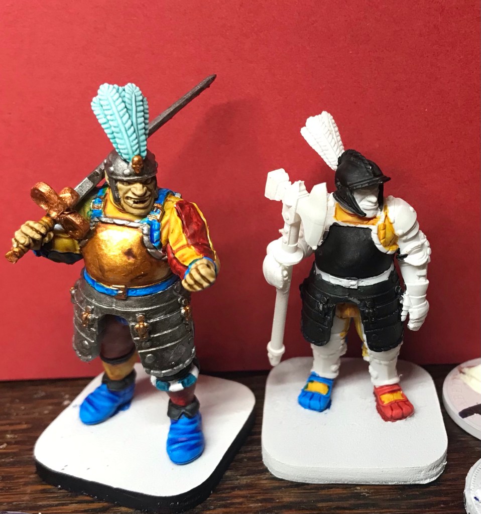 As you can see the second one has blackened armour. The arms and legs on his harness are going to be gun metal. More to make each if the six stand out than any other reason.