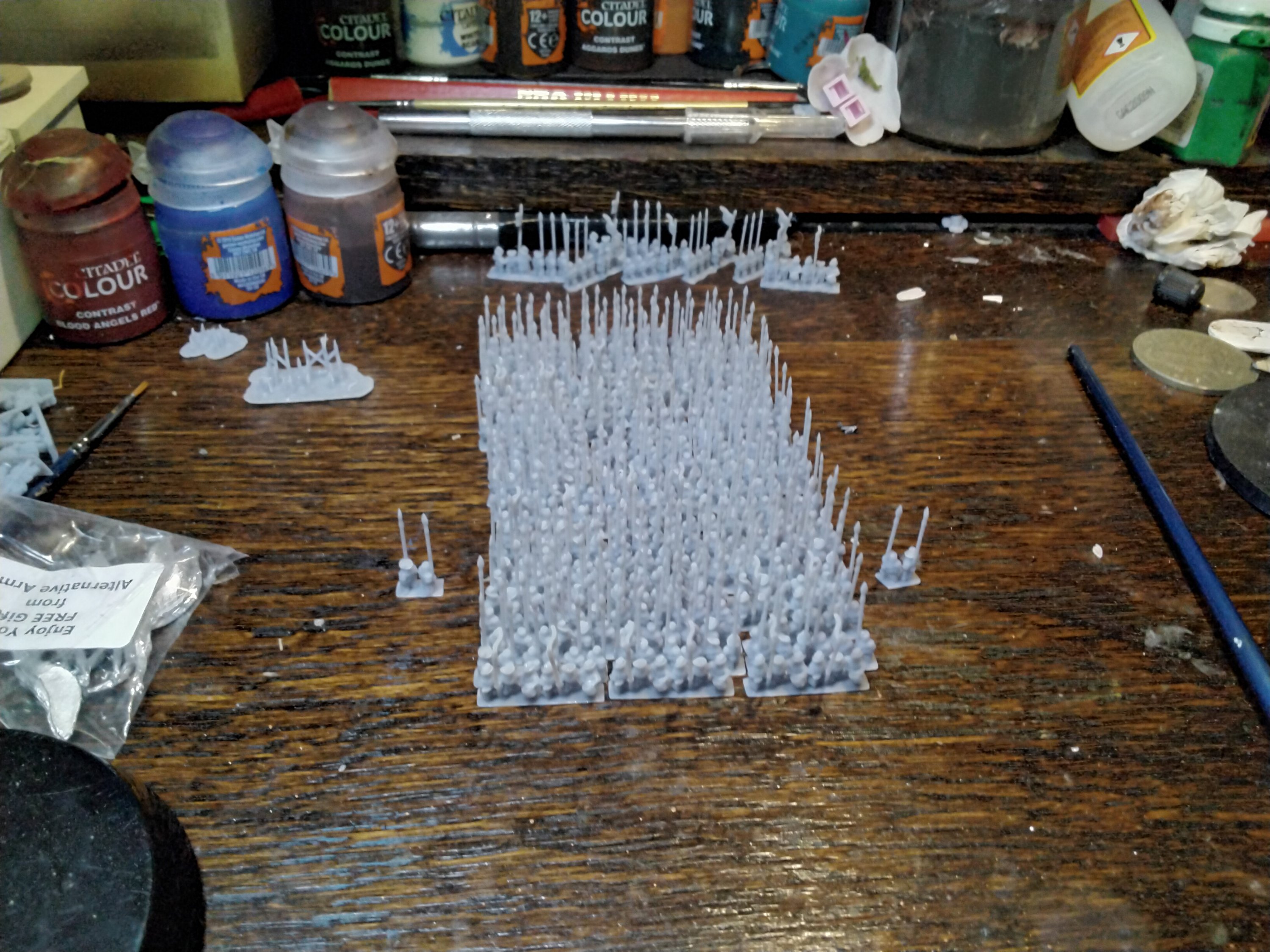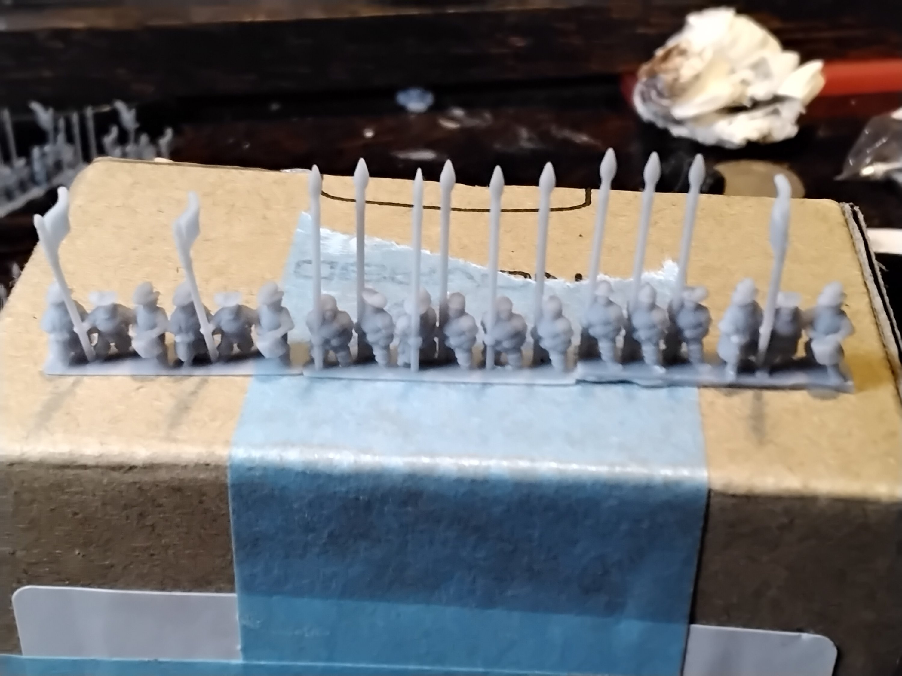 Now in case you are wondering there are 75 strips of pikes above. This in fact won’t be enough to cover my four units of Pike… each base has three ranks behind the metal front one, with two wide for each one … okay there are two spare which can be seen in the photo above. I will use these to make casualty markers.