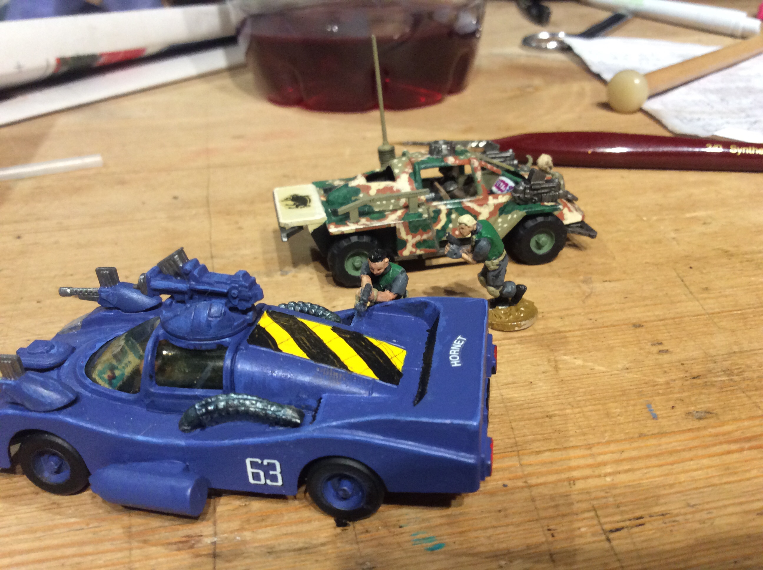 My drivers have been dispatched, which means I can get the cars finished soon. The piping on the interceptor was glued down and given it a blue wash. I am considering adding the missile launchers on backwards to the side holes just visible above the green bike. These would become either boosters or smoke dispensers. As the end of the hose is directly above the hole it might work….🤔