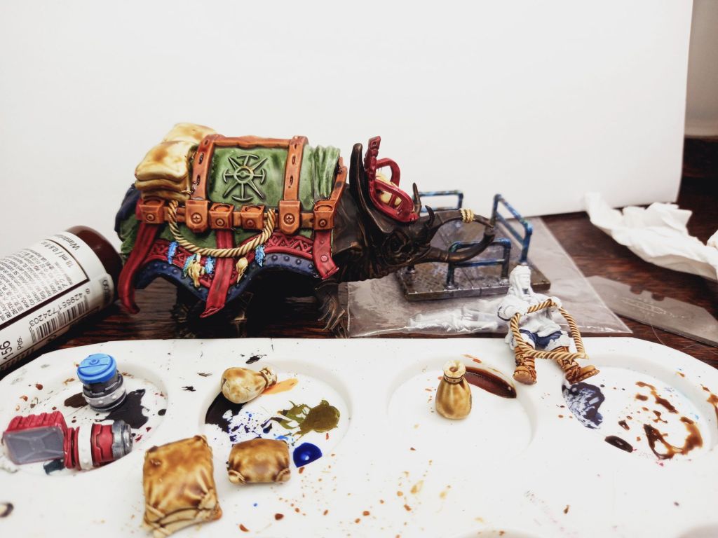 The platform is now glued in place. Everything on it is just shoved on. The unpainted dude is probably not going to be there permanently. The original has a central pole on the platform with a tin roof. It just looked wrong to me so I am either going to make a tent type idea, shove a tarpaulin over the goods or just leave it open. I haven’t decided yet.