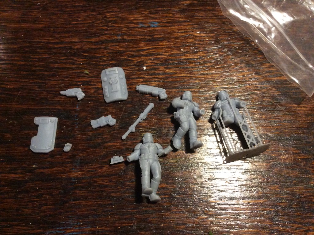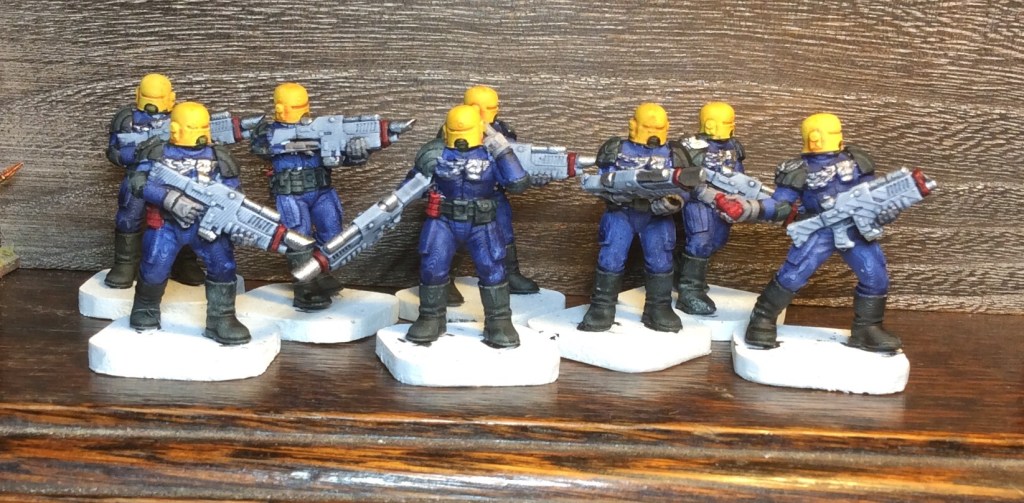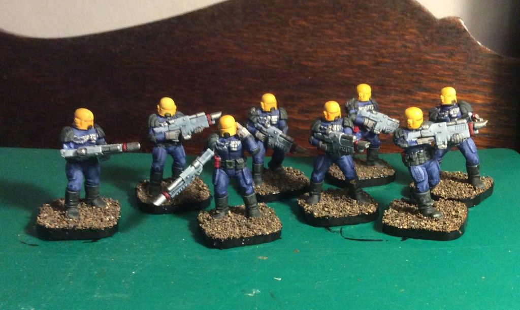 I will get the metallics done tomorrow This will be gold or brass on the chest decoration and on the shoulder decoration that two of them have. I will also add gun metal to the weapons. I do quite like these as miniatures and might sort myself out some …I actually have the multi part ones too…a few with riot shields and combat shotguns would go well… not to mention the sergeant and officer to go with these ones. Hopefully I will be bothered to get the printer running tomorrow evening.