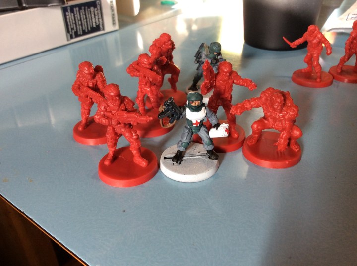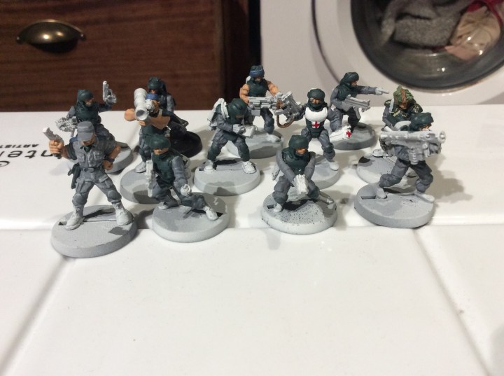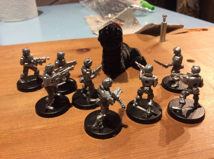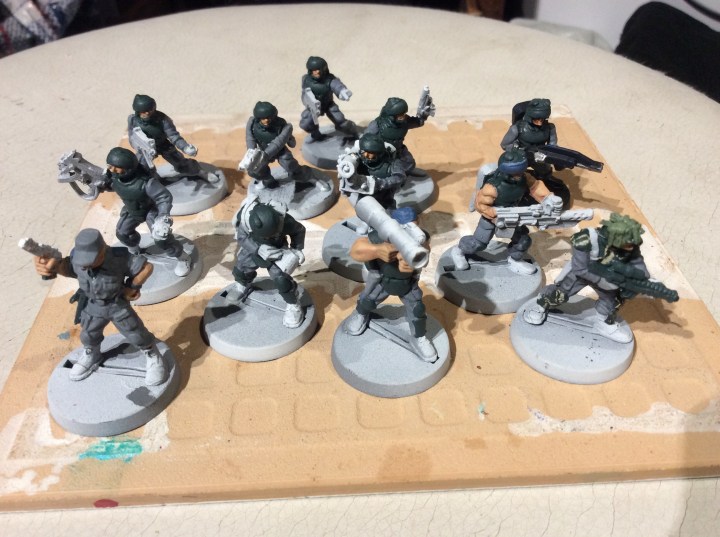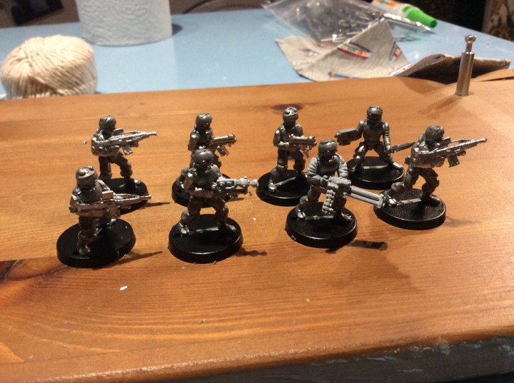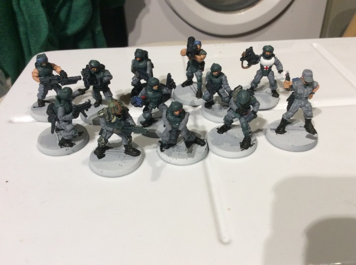 I managed to get these done whilst being forced to watch the Hobbit. Anyway 3 were armed with the assault rifle, 2 with SMG’s, an officer type and a couple of heavy weapons. The HMG was a straight forward add arms to plastic body type of thing. The flamer was a bit trickier in that I needed to butcher various bits and pieces to take it from a skinny armed flamer lady to a male trooper. I don’t have a problem with females in the unit, just the arms looked totally wrong on the larger plastic body. I even tried adding a female torso but it still looked wrong. The heavy weapons came from the ganger set and not the trooper one.