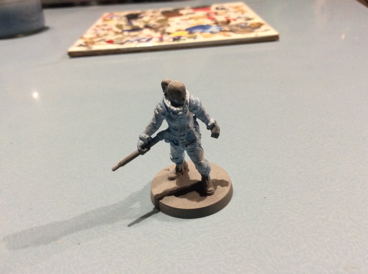 I put some very thinned light blue paint over the white to try and get a shade into the crevices. I will give her a dry brush of white to lighten the suit up a bit.