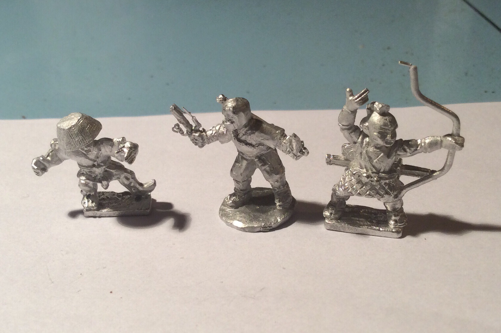 Above we have a TS peasant, a BVG ninja and then a TS archer. They will certainly do the job. In this case the TS minis have a whole lot more detail, but a ninja, in a typical ninja suit doesn’t exactly have a whole lot of detail to have. On the up side, they are all unique poses, armed with ‘typical’ ninja weapons and equipment. The only archetypal weapon missing is a throwing star.