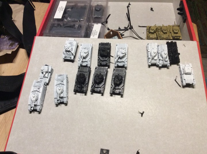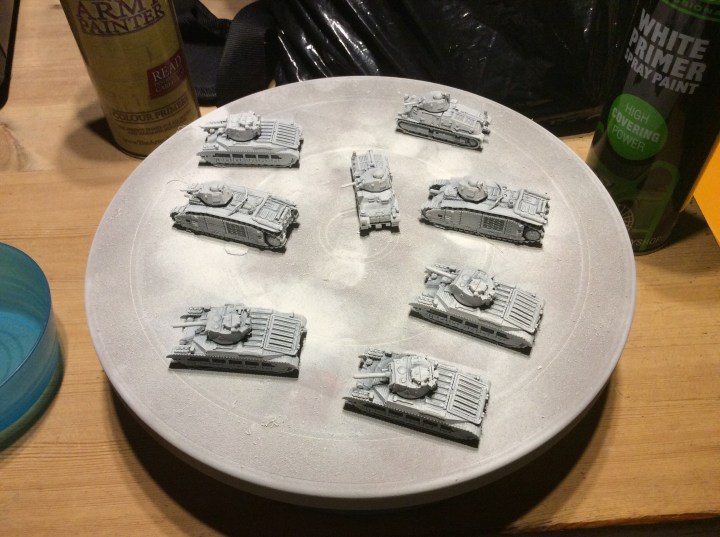 So today involved some more tanks and giving them a spray of white undercoat so that I can use the airbrush to get some colour on. So I now have six Matilda, three Char B and four Somua (technically I have four and a bit Char B, but I need to print another turret before it is finished).