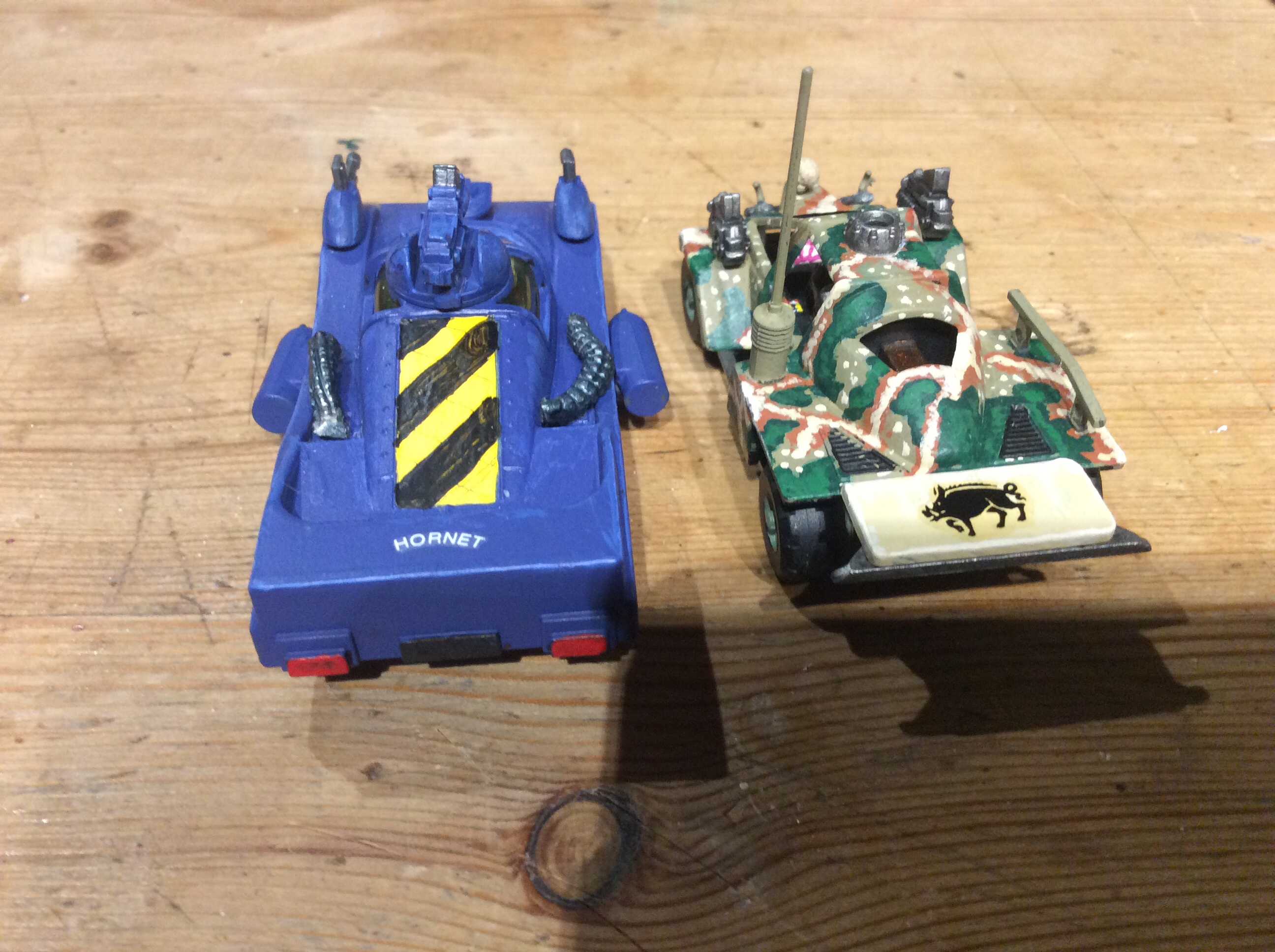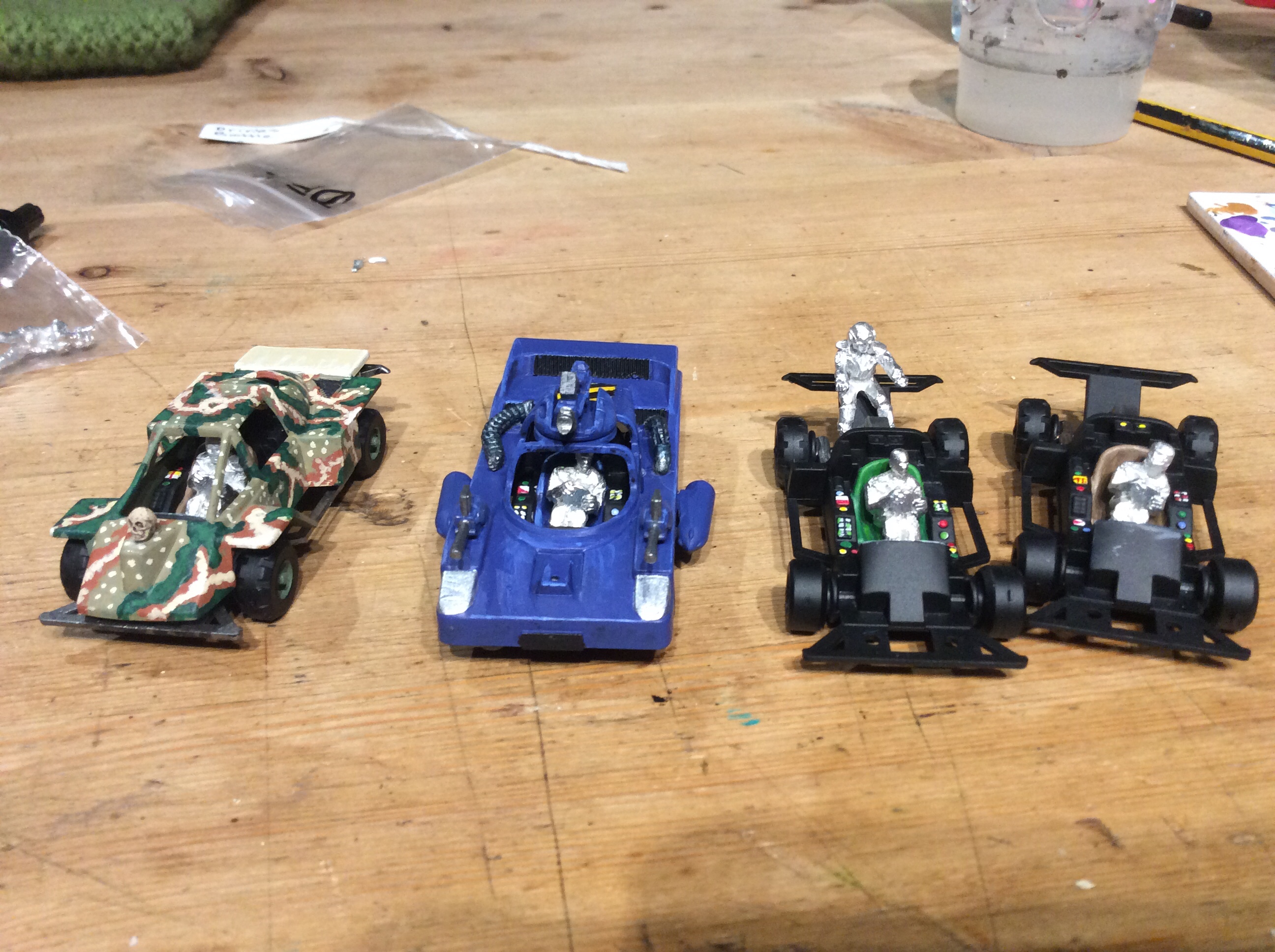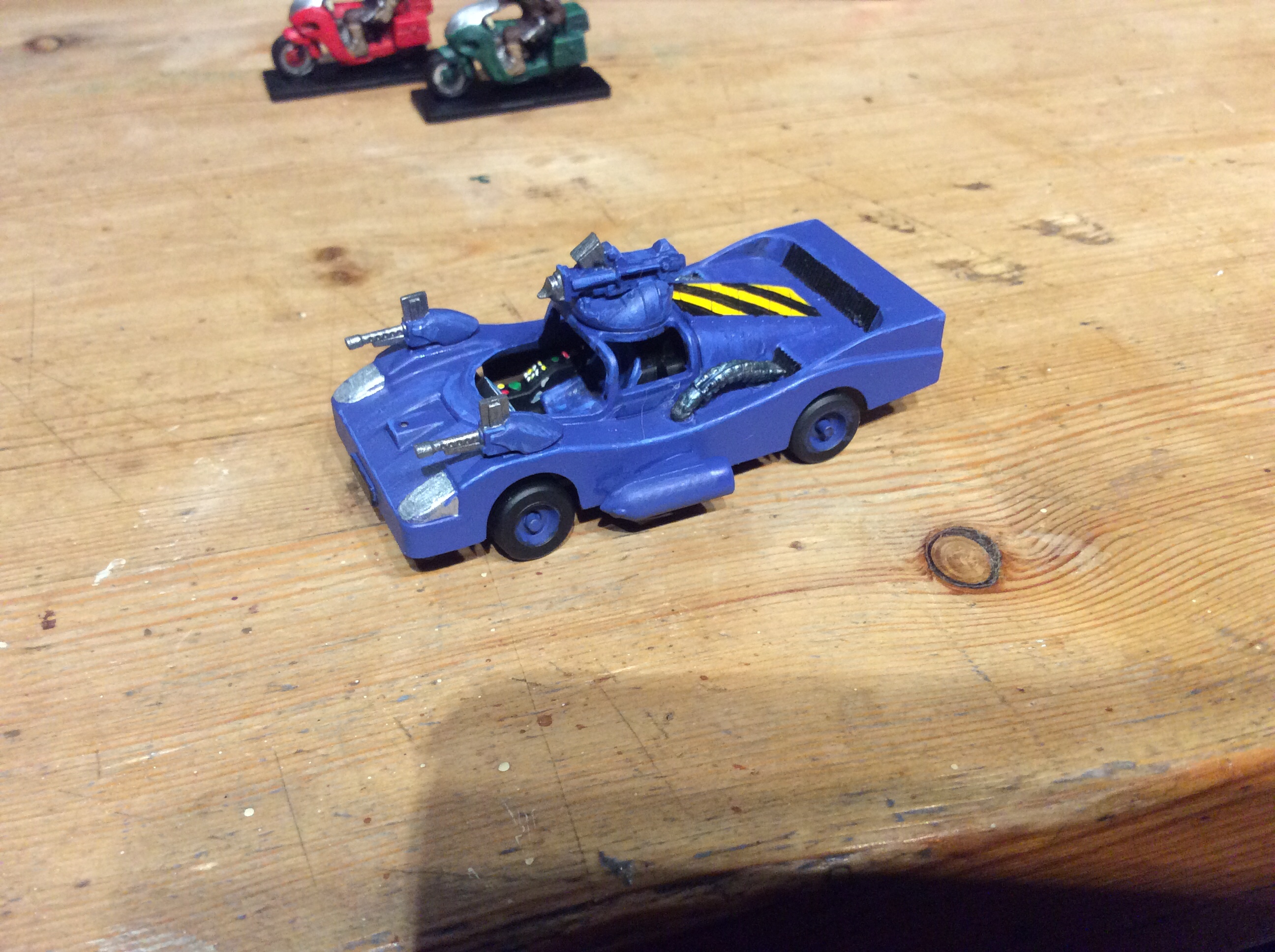 My drivers have been dispatched, which means I can get the cars finished soon. The piping on the interceptor was glued down and given it a blue wash. I am considering adding the missile launchers on backwards to the side holes just visible above the green bike. These would become either boosters or smoke dispensers. As the end of the hose is directly above the hole it might work….🤔