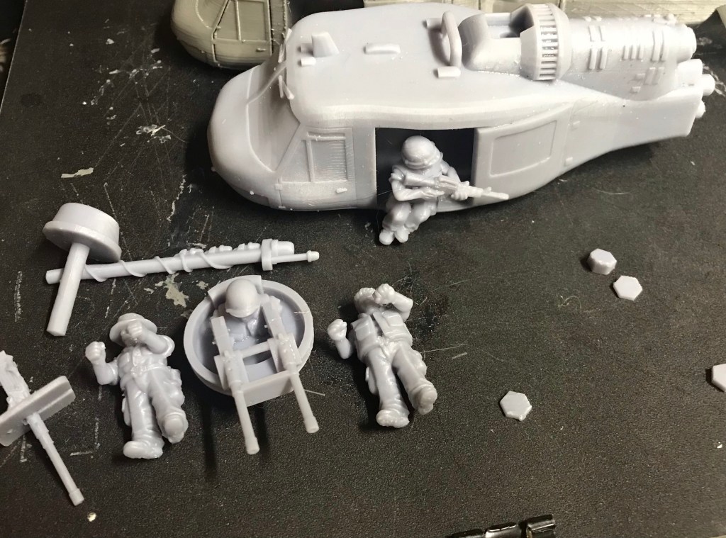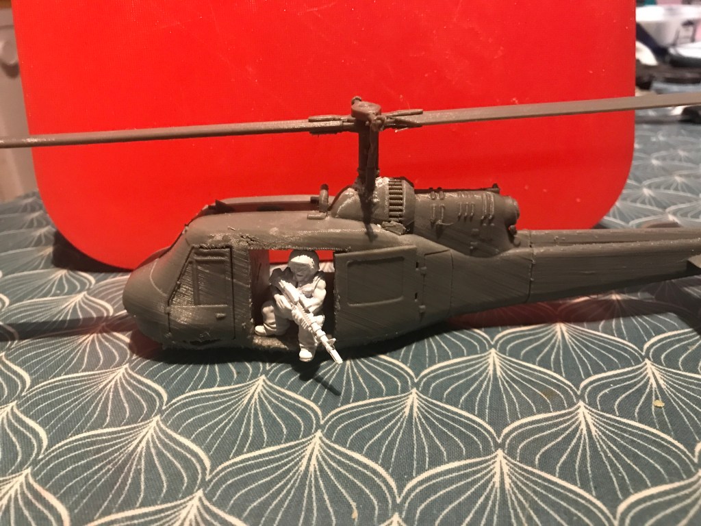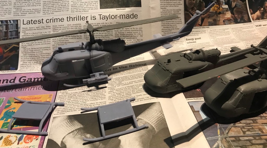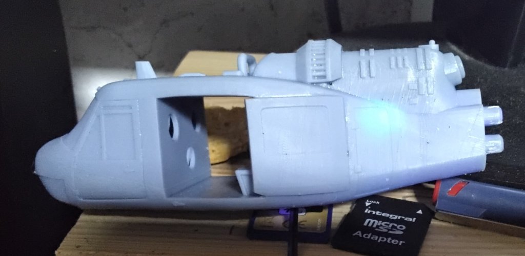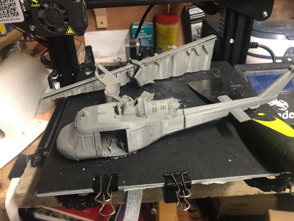 The resin and filament machines have different tolerances. The hole for the skids to fit in is too small. They are a snug fit on the resin version. So options I have are to redo the skids on the FDM machine and/or make some more Hueys on the resin machine. Would you like to guess which way I will go?