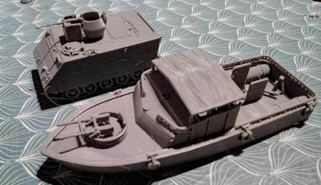 The only casualty of these is a bit of a bent 50 cal on the M113 and the flag on the PBR snapped off. The boat still needs things like its radar and rear M60 etc printing. I will probably do these on the resin printer along with the crew.