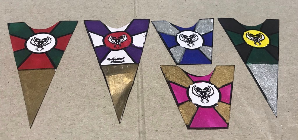 As you can see, I knocked up some colours to add to the flag pole. To be frank, it will probably change to something a bit darker. I printed out the blanks and coloured the bits with a selection of Sharpies.