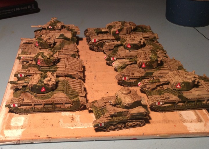 It’s a bit late in the day to worry about it now. This is the first real time they have been next to each other. Tomorrow they will get a wash and some numbers and that will be them pretty much done. The kubelwagen will get the silver and blue Contrast paint for the windows. Once all of the tanks are painted I will give them a few coats of varnish to help them last a bit longer.